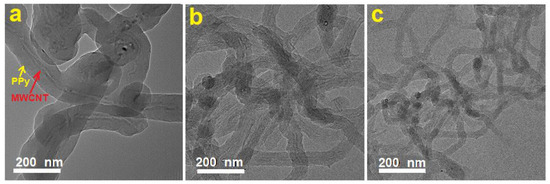 Figure 4 shows TEM images at the same magnification of typical MWCNTs/PPy nanocomposites (a: 1.1 wt.%, b: 4.6 wt.%, c: 14.6wt.%). In this figure, it is clear that the MWCNTs are located at the cores of these 1D structures, and the PPy are forming the shells. With increasing the percentage of MWCNTs, the thickness of the coated PPy decreases and vice versa as illustrated in Figure 4a–c. This result is remarkable, by means it is possible that the presence of SDS as a surfactant could favor the PPy growth smoothly in the side walls of MWCNTs, which themselves acted as 1D templates. This result is much better than that reported earlier [14] on producing MWCNTs/PPy nanocomposites using p-toluenesulfonic acid (TSA) as a dopant and iron chloride (FeCl3) as an oxidant. They obtained PPy nanoparticles at the surface of the MWCNTs, without a uniform coating [14]. It is clear that the used surfactant in our case is the key factor on obtaining 1D core/shell MWCNTs/PPy nanocomposites.