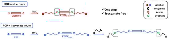 Comparative routes toward poly(trimethylene carbonate) (PTMC)-urethane by ring-opening polymerization (ROP)-amine route and polyaddition of isocyanate in PTMC terminal diols.