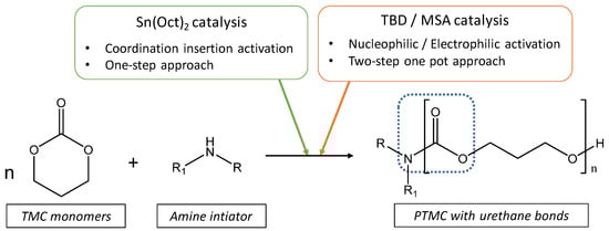 In this perspective, a more straightforward strategy to generate urethane bonds within the PTMC materials could be by ring opening polymerization (ROP) using aminated initiator, so-called ROP-amine. ROP-amine route has many advantages related to the other pathways of urethanization of PTMC chains. As illustrated in Figure 1, toxic isocyanate reactant is not required and the versatility of amines is much more extended than isocyanates. This variety concerns the functionality of amines (mono, di, tri, multi), the nature of amines (aliphatic, cycloaliphatic, aromatic…), the origin of amines (bio or petrosourced), and so on. Moreover, the strategy is shorter—only one step to reach to poly(carbonate urethane) instead of two steps for post-urethanization. No precaution of stoichiometry is mandatory as the case for polyaddition between diiocyanate and diol precursors. In the literature, ROP-amine has been already investigated for the polymerization of lactide and ε-caprolactone monomers [,,]. ROP-amine for polyesters allows to generate amide groups and shows to modify the properties of the polyester compared to hydroxyl initiation []. However, to the best of our knowledge, ROP of TMC has been exclusively initiated with hydroxyl functions but amines have never been studied as initiator for TMC polymerization.