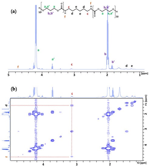 Finally, ROP-amine of TMC has been tested using stannous octanoate catalyst. The 1H NMR spectrum from Figure 3a shows the success of the ROP-amine with a conversion close to 100% after 24 h. The conversion rate is calculated by comparing the integrated areas of characteristic peaks of the protons from the monomers at 4.4 ppm with those from the growing polymer chains at 4.2 ppm (Ha). Nevertheless, it is crucial to prove that the generated polymer has been well initiated by 1,6-hexanediamine. For that, 2D COSY NMR (Figure 3b) spectroscopy allowed to correlate a new peak at 3.1 ppm (Hc) to the characteristic peak of the amino group at 4.7 ppm (Hf), and also correlated to the characteristic peak of the protons from the aliphatic 1,6-hexanediamine at 1.5 ppm (Hd) which can be assigned to the protons in alpha position of the resulting urethane. This peak has been used to calculate the average degree of polymerization in number of the PTMC which was close to the expected one (DP100) (Table 1).