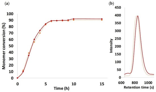 Comparison of (a) kinetic profile of PTMC initiated by 1,6-hexanediamine using Sn(Oct)2 (line red) 1,6-hexanediol (dots orange), and (b) SEC traces of the resulting polymers.