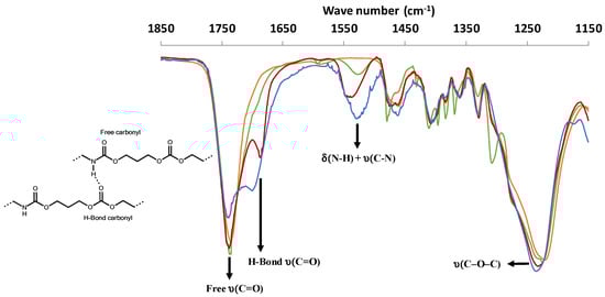 The urethane groups along the PTMC chains resulting from the initiation step of the ROP-amine of TMC was monitored by FTIR spectroscopy using various amine and diamine initiators in reference to PTMCD-OH (Figure 5). The study was realized on short PTMC chains (DP10) to magnify the urethane contribution related to carbonate ones. The characteristic carbonate signals of υ(C=O) and υ(C–O–C) around 1741 and 1222 cm−1, respectively were detected for all polymers including PTMCD-OH. The comparison between mono-, di-, and triamine initiators put in relieve the number of urethane groups along the PTMC chains with the increase of the amide II band intensity (δ(N–H) + υ(C–N)) at 1523 cm−1. Interestingly, we clearly see the apparition of supplementary peak around 1700 cm−1 for PTMCD-NH et PTMCT-NH but totally absent for PTMCOH. As described in the literature this peak corresponds to the carbonyl involved in the H-bonds (named H-bonds υ(C=O) in the Figure 5) []. This can explain the increased trend in function of the number of urethane groups.