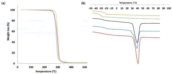 The thermal stability was carried out using a NETZSCH TG 209F1 Libra analyzer (Selb, Germany). The experiments consisted in registering the weight loss of the sample under nitrogen flow (40 mL·min−1) in function of temperature ranging from 20 up to 600 °C with a heating rate of 10 °C·min−1.