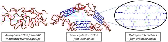 The impact of urethane bonds on thermal properties was also assessed for higher molar mass using a PTMC with DPn around 200 and 500. Surprisingly, as summarized in Table 3, a similar crystallinity was measured for all the DPn with a melting temperature around 41 °C, and a similar melting enthalpy around 50 J·g−1. Such semi-crystalline character for high molar mass of PTMC has never been reported before. Hence, we can hypothesize that the hydrogen bonds from the urethane groups organize the polymer chains and therefore favor the crystallization of the PTMC chains (Figure 7). It has to be noted that despite the low ratio of urethane groups, the crystallization occurs regardless the molar mass.