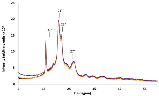 The crystallization character of ROP-amine PTMC was finally investigated by XRD analyses. The analyses were performed on the samples that showed the highest crystalline ratio in DSC, including PTMCD-NH-Φ and PTMCD-NH for DPn at 100, 200, and 500 (Figure 8). For all the samples, four characteristic peaks of crystalline PTMCNH are observed with the highest double peak 2θ around 21–22°, a sharper peak at 16°, and an additional small peak at 27°. Consequently, the presence of such sharp peaks in XRD proves the existence in the polymer samples of a relatively well-ordered phase which attests the occurrence of a crystalline phase. The X-ray diffraction profile of PTMCNH closely resembled to the semi-crystalline poly(alkylene carbonate) with high number of CH2 groups [], or else the PTMC after crystallization upon stretching []. Indeed, XRD pattern of these poly(alkylene carbonate) specimen are characterized by strong reflections between 20 and 22.5° and by weaker reflections between 25 and 25.8°. In addition, diffraction peaks exhibited a similar location for all the measured samples, suggesting that the crystalline phase was similar for the samples and present a similar proportion of crystalline phase. However, it has to be noticed that the characteristic sharp peak that described the crystalline phase do not return to the base line which is typically due to the overlapping with the wide signal traditionally obtained with amorphous phases. This behavior is in agreement with the literature like in the case of the copolymer of PLLA-PTMC, which shows the apparition of crystalline peaks characteristic to PLLA crystallization which overlap the wide halo due to the amorphous phase of PTMC []. The degree of crystallinity was determined for all the tested PTMCNH around 33%. The XRD results were consistent with the DSC data and can then give another proof that the assembled crystalline phase was generated by the formation of hydrogen bonds from the urethane groups.