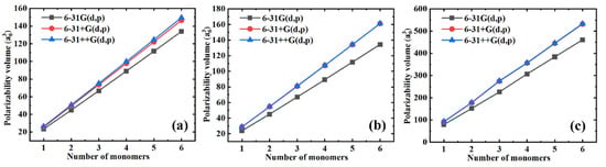 Generally, a relatively large basis set needs to be selected to achieve the convergence in polarizability. However, the size of the basis set is always proportional to the computational cost, so that the balance between the computational cost and precision must be considered during the selection of the basis set. Three basis sets, including 6-31G(d, p), 6-31+G(d, p), and 6-31++G(d, p), were employed during the simulations to better indicate the influence of the basis sets on the polarizability of the selected polymers. Figure 1 shows the simulated isotropic polarizability as a function of the number of monomers for different polymer materials with different basis sets. We can see that the polarizability gradually converges when increasing the basis sets for all polymer materials. Furthermore, there is only a slight (Figure 1a) or no (Figure 1b,c) improvement in the precision of the polarizability gained by increasing the basis sets from 6-31+G(d, p) to 6-31++G(d, p). Therefore, since the basis set 6-31++G(d, p) was more time-consuming than the basis set 6-31+G(d, p), we chose the 6-31+G(d, p) basis set to further simulate the polarizability.
