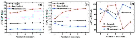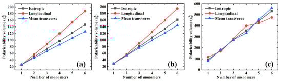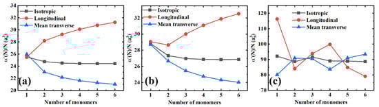 In addition, Figure 2 shows both the longitudinal () and mean transverse () components of the polarizability and its isotropic value to better understand the influence of the polymer chain’s length on the polarizability. From Figure 2a–c, three features can be defined. First, all the polarizability components seem to depend linearly on the number of monomers, i.e., the length of the polymer chain, which is the typical behavior of saturated polymers [,]. Second, the slopes of the isotropic, longitudinal, and mean transverse polarizabilities are quite different. The longitudinal component slope is the largest, followed by the slope of the isotropic polarizability, while the longitudinal component exhibits the smallest slope. The fact that the longitudinal polarizability increases significantly faster than the mean transverse component will certainly cause the polarizability anisotropy, affecting the dielectric constant of the polymer materials. These influences will be discussed in detail in later sections. Finally, as PS has a relatively large monomer, there seem to be apparent changes in the slopes of both the longitudinal and the mean transverse polarizability components. As shown in Figure 2c, small deviations from the linearity occur. This might be attributed to the coupling effect of the longitudinal and the mean transverse components, while when the longitudinal component increases, the mean transverse component decreases, and vice versa. However, the isotropic polarizability slope is almost unchanged (see the gray square in Figure 2c).