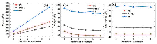 Different volume representations for three typical polymer materials. (a) The volume as a function of the number of monomers; (b) The volume per monomer unit as a function of the number of monomers; (c) Differences in the volume between the consecutive polymer chains.
