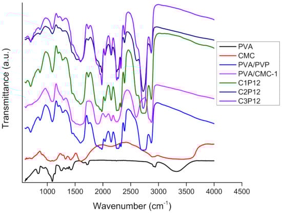 FTIR-ATR spectra of PVA, CMC, PVA/PVP, and tricomponent PVA/PVP/CMC electrospun nanofibers (all spectra are shifted vertically for clarity).