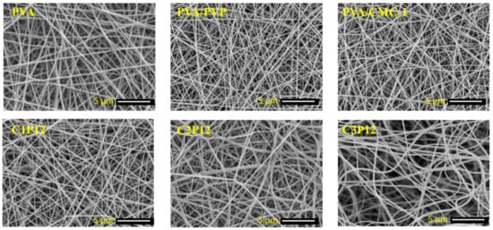 Scanning electron microscopic images of PVA, PVA/PVP, and tricomponent PVA/PVP/CMC nanofibers (each SEM image has a navigation bar that shows that the scale bar for all specimen was 5000 nm and acceleration energy was 10 kV).