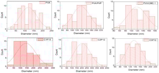 Diameter distribution of PVA, PVA/PVP, and tricomponent PVA/PVP/CMC nanofibers (the X-axis shows the diameter in nm, while the Y-axis shows the number of fibers in that diameter range).
