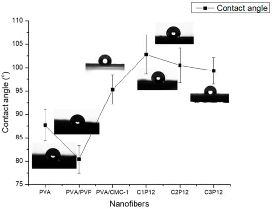 The hydrophilic or hydrophobic nature of polymeric nanofibers plays an important role while targeting final applications []. Food packaging should be hydrophobic to sustain in the wet and moist environment. Hydrophilicity of substance may be analyzed by calculating the water contact angle (WCA). WCAs of crosslinked PVA, PVA/PVP, and CMC based composite nanofibers were calculated to evaluate the degree of hydrophilicity/hydrophobicity of nanofibrous mats. It was stated in the literature that nanofibers of uncrosslinked PVA tend to be hydrophilic while the water contact angle increases with an increasing degree of crosslinking. It also depends on the type of crosslinking agents used to crosslink PVA, and the method of crosslinking as well []. Figure 4 shows contact angles for each sample. It can be observed that the water contact angle of crosslinked PVA was observed at 87.7° while it shows a slight decrease (80.4˚) in the case of PVA/PVP nanofibers. The addition of CMC caused an increase in the water contact angle of nanofiber mats. WCA for PVA/CMC, C1P12, C2P12, and C3P12 were recorded at 95.3°, 102.8°, 100.5°, and 99.3° respectively. An increase in the contact angle may be because of interchain and intrachain bonding of PVA, CMC, and PVP in the result of crosslinking. It was concluded that all nanofibers containing CMC possess enough hydrophobicity to be used in food packaging applications. However, hydrophobicity may be increased by further crosslinking of nanofibers but that will lead to the reduction of biodegradability of CMC based nanofibers.