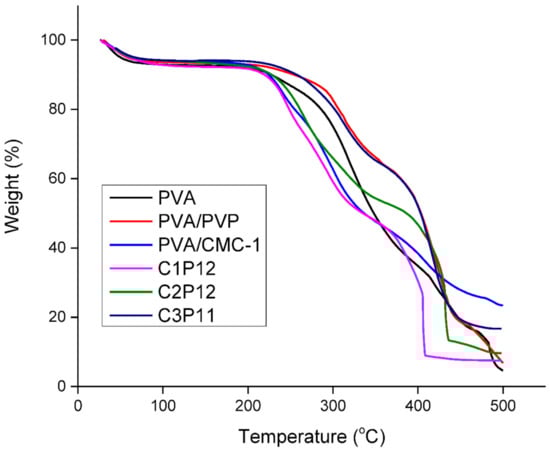 Thermogravimetric analyzer (TGA) plots of PVA, PVA/PVP, and CMC based composite nanofibers representing thermal degradation behavior of nanofibers.