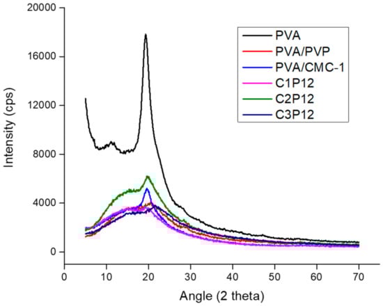X-ray diffraction (XRD) spectra of PVA, PVP, and PVA/PVP/CMC nanofibers.