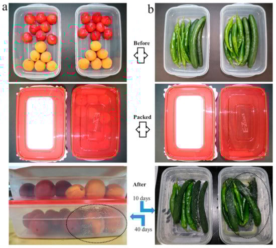 Real time observatory experiments for suitability of nanofibers based food packaging (a) for fruits up to 40 days and (b) for vegetables up to 10 days; relative humidity was 75% at 2 °C temperature (containers with red translucent lids are plastic based, while white lids represent nanofibers based lids.)