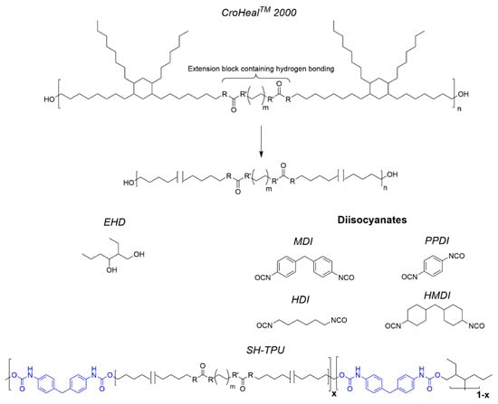Chemical structure of CroHeal™ 2000, EHD and MDI and the molecular structure of the segmented SH-TPU used in this work with the soft block containing hydrogen bonds and aliphatic side branches, and the hard blocks containing aromatic interactions and hydrogen bonds.