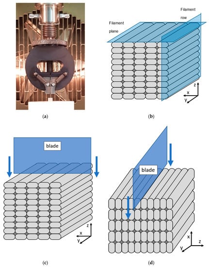3D printed samples were tested in two directions, the xz- and the xy-direction. These were selected as they typically give the most extreme results in terms of anisotropy [,,]. Figure 2b shows a schematic of the samples with the axis system used during the test. The layers are stacked in the z direction during printing. During the mechanical test in the xz-direction, the sample was positioned such that the blade moved along the z direction in the xz-plane (Figure 2c). During the test in the xy-direction, the blade was positioned to move along the x-axis parallel to the xy-plane (Figure 2d). Two samples were tested in each direction.
