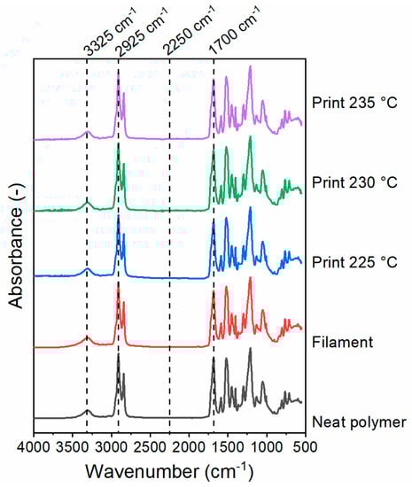 FTIR spectra of the SH-TPU as produced (neat polymer), as filament and as 3D printed polymer at different printing temperatures (225, 230 and 235 °C).