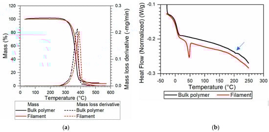 Thermal analysis results of the SH-TPU in the bulk and the filament form. (a) TGA at 5 °C/min; (b) DSC at 5 °C/min (endo down); the blue arrow indicates the reproducible endothermic peak at near 200 °C.