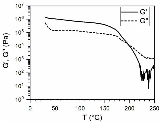 Once the upper temperature was fixed, rheology was performed to select the most appropriate temperature range for printing. Figure 5 shows the results of the temperature sweep rheology. The elastic modulus (G’) and the viscous modulus (G”) crossed at roughly 195 °C. This temperature was close to the endothermic event observed during DSC measurements at 205 °C, which was associated with dissociation of reversible groups in the hard block. Above this crossover temperature, the polymer behaves like a viscous liquid, thereby establishing the lower temperature limit for melt-processing into a filament and during the 3D printing.