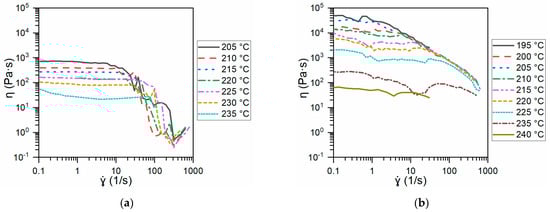 Figure 6 compares the viscosity (η) of Ninjaflex (a) and the SH-TPU used in this work (b) as a function of the shear rate () for different temperatures above the crossover point temperature shown in Figure 5. For all the temperatures used, the viscosity of Ninjaflex polymer remained constant with the shear rate until a shear rate between 10 and 100 s−1, depending on the temperature, was reached. At this point, the viscosity suddenly dropped and became highly temperature independent. As can be seen in Figure 6b, the SH-TPU did not display this sharp drop, and maintained a relatively high viscosity at high shear rates at all the studied temperatures.