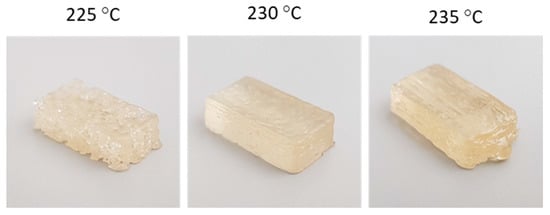 Figure 8 shows pictures of 3D printed SH-TPU samples. A significant difference in quality can be observed between the samples. The samples printed at 225 °C were of relatively poor quality, with a high porosity, visible on the outside of the specimen, and in agreement with the higher viscosity during printing as given by Figure 6b. Samples printed at 230 °C and 235 °C looked more regular, where the samples printed at 230 °C were of the best quality based on visual inspection. The samples printed at 235 °C showed some over-extrusion at the right end. The printing of the SH-TPU led to comparable chemical composition to the bulk polymer as shown in Figure 3. Additionally, a more complex hollow vase structure could be 3D printed using SH-TPU (shown in the Support information: Figure S14 in the Supplementary Materials).