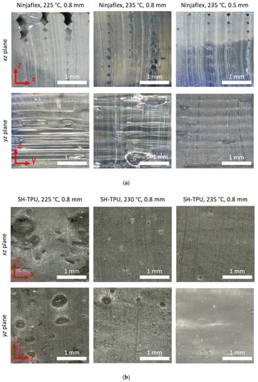 Microscopy images of the 3D-printed samples at different printing conditions: (a) Ninjaflex and (b) SH-TPU. The xz-plane shows defects in between filament planes, and the yz-plane shows defects between filament rows.