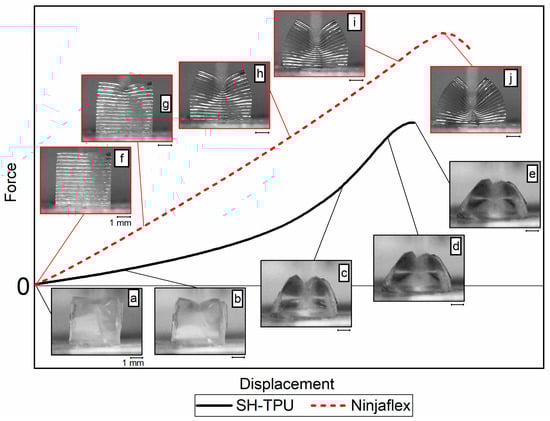Figure 10 shows the typical force-displacement response of an SH-TPU sample and a 3D printed Ninjaflex sample during the compression cut test with arbitrary units. The mechanical response of each polymer is accompanied with micrographs corresponding to each displacement in an attempt to facilitate the interpretation of the force–displacement curves obtained in the used testing conditions.