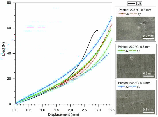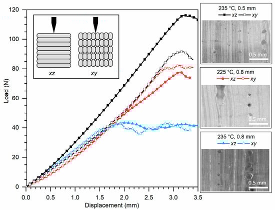 The load–displacement results are in good agreement with the quality of the prints shown in the micrographs in Figure 9a. The samples with the largest void area (235 °C, 0.8 mm) also resulted in the poorest mechanical response independent on the cut plane. The sample printed at 225 °C and 0.8 mm showed a higher mechanical response in agreement with a lower void content, yet still independent on the cut plane. The sample printed at 235 °C and 0.5 mm shows comparable, yet smaller, voids in the xy-plane but significantly lower defects in the xz-plane. The higher maximum load for this sample in the xz-direction can be therefore explained by the good fusion between filament planes perpendicular to the cut (Figure 9a) while the lower properties in the xy-direction, comparable to the sample 225 °C/0.8mm, can be attributed to the limited interfilament fusion parallel to the cut, which was also seen in Figure 9a.