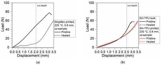 Figure 13 shows the results of the healing experiments for the xz-cut-plane by comparing the load–displacement of pristine and damaged-and-healed samples. The healing tests were performed on 3D printed samples showing the lowest anisotropy that still has good mechanical properties. It turned out that, for both polymers, these requirements are met in samples print at 225 °C and 0.8 mm infill distance, as seen in Figure 11 and Figure 12. In Figure 13a,b, the vertical dotted black lines indicate the depth of the cut that was performed to the samples before healing in relation to the displacement during the test.