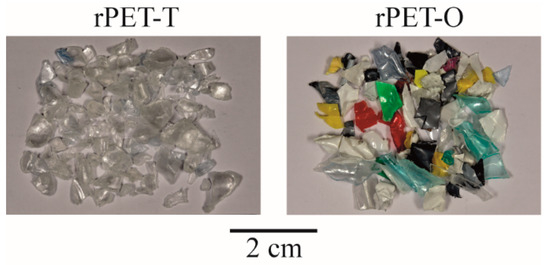 In this communication, two commercially recycled PET (rPET) grades reclaimed mainly from post-consumer containers were used as raw materials. Transparent rPET bottle grade flakes (referred to as rPET-T) were provided by a Spanish waste treatment company (PET Recuperaciones de Plásticos de Barcelona). A physical mix of transparent colored rPET with opaque rPET flakes (referred to as rPET-O) was kindly supplied by Suez (Bayonne, France) under the trade name Floreal. The visual aspect of the received post-consumer flakes of both materials can be seen in Figure 1.