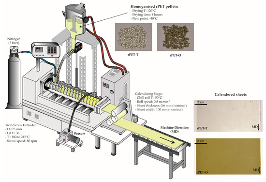 A two-step process was used to manufacture rPET sheets. Prior to each processing step, rPET materials were dried for 4 h at 120 °C in a PIOVAN hopper-dryer (DSN506HE, Venice, Italy) with a dew point of −40 °C. During both processing stages, a N2 blanket was introduced in the feeding zone of the co-rotating twin-screw extruder Collin Kneter 25 × 24D (COLLIN GmbH, Ebersberg, Germany) having a screw diameter of 25 mm (L/D = 36) and seven heating zones.