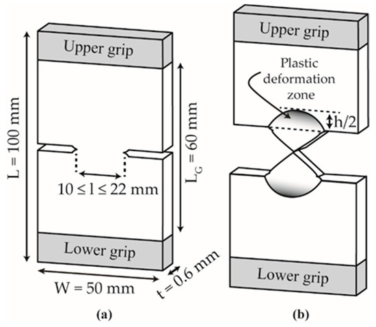 For the EWF study, mechanical experiments and deformation measurements were performed using identical devices as described in Section 2.5.1. Experiments were performed at RT and at a constant crosshead speed of 10 mm·min−1. Deeply Double-Edge Notched Tensile (DDENT) samples were extracted from the center of the sheet, parallel to MD with the following dimensions: overall length L = 100 mm, distance between grips LG = 60 mm, width W = 50 mm, and thickness t = 0.6 mm. A DDENT sample is shown in Figure 3a. Five ligament lengths, l, between 10 and 22 mm with a step of 3 mm were tested and repeated three times. Before testing, initial cracks were sharpened with a fresh razor blade. The total work of fracture, Wf, was calculated by integrating the area below the load–displacement curves for each tested ligament length.