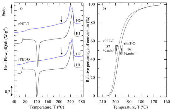Figure 4. (a) First (H1) and second (H2) DSC heating scans at 10 °C·min−1 for rPET-T and rPET-O calendered sheets (Endo: direction of the endothermic transitions). The black arrow indicates the first melting peak in the second heating scans. (b) Relative percentage of conversion as a function of the temperature upon cooling at 10 °C·min−1. The maximum rate of conversion in %·min−1 is indicated for each sample.