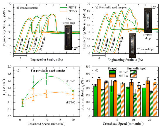Figure 5. Effect of the crosshead speed on the mechanical properties of unaged and physically aged rPET-T and rPET-O: (a,b) engineering stress–strain curves; (c) strain energy density value up to the onset of necking versus crosshead speed, and (d) strain at break values versus crosshead speed.
