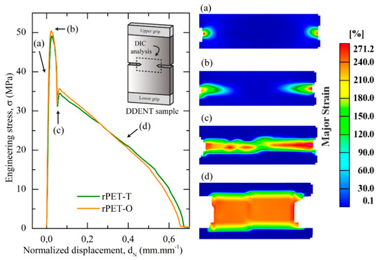 Figure 6 displays the engineering stress versus the normalized displacement curves for unaged rPET-T and rPET-O samples. It is noteworthy that after yielding, an instantaneous stress drop was observed for both materials. A similar phenomenon has been reported for amorphous copolyesters [19,47] and corresponds to the full ligament yielding of the DDENT samples. In this study, this hypothesis was carefully examined using DIC analysis as shown by the reported strain fields in Figure 6. It is important to note that the yielding process initiated from both notches in point a. That is, well before the stress maximum (point b) as a result of the high stress concentration induced by both sharpened notches. Before crack propagation, the expected full plastic collapse of the ligament was observed in point c, which fulfilled the abovementioned first basic criterion of the EWF concept. Similar observations were obtained for physically aged samples, therefore for the sake of clarity, results are not shown. The self-similarity requirement between load–displacement curves was verified during experiments for all the samples. Finally, in Figure 7, the linear increase in the specific work of fracture with increasing ligament length confirmed that measurements were performed under pure plane stress conditions. Accordingly, all basic requirements were satisfied and the EWF concept could be applied in order to compare the fracture toughness of both post-consumer unaged and physically aged PET materials.
