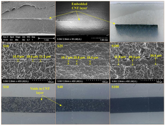 The SEM micrographs and optical images are shown in Figure 2. The CNT layer-embedded between two polymer layers can be clearly seen in these images. It was noted that as the sprayed volume of the CNT solution increased, the thickness (shown in SEM micrographs) and density (which can be visualized in optical images) of CNT layers also increased. The approximate CNT layer thickness was about 11 μm in sample S10, which increased to about 19 and 31 μm in samples S25 and S100, respectively. Optical images revealed that many voids were present in sample S10. The size and number of voids decreased in sample S40, while no visible voids were identified in sample S100. This could be attributed to the total amount of CNT solution used for each sample type. Seemingly, 10 mL of the CNT solution used for sample S10 was not enough to fully cover the spraying area which resulted in many voids. An increase in CNT solution amount decreased the voids in the CNT layers for the subsequent samples (S25 to S100). This also confirmed the good deposition of CNTs with increase in spraying volume, resulting in a uniform dense conductive layer.