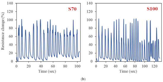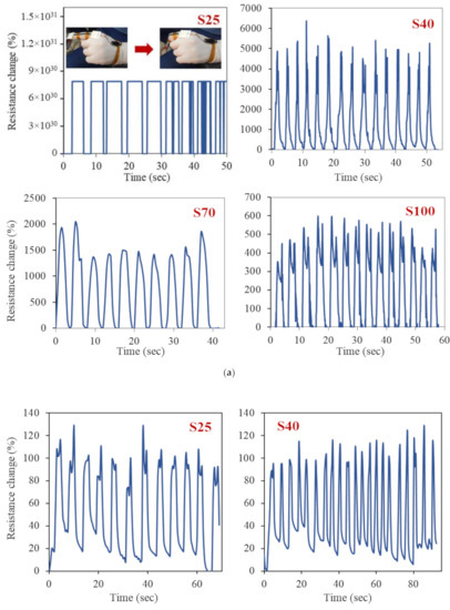 The sensors also showed a good response against wrist bending. Since the bend angle in wrist bending (~60°) was less than the finger bending (>90°), the change in resistance was normally lower than the change against the finger bending [10]. Similar behavior was observed in this study, with resistance change in the range of about 50–130% (Figure 3b). Although a slight decrease in resistance change was observed from samples S25 to S100, the change in the sensitivity of the samples was not that prominent as it was against finger bending. Samples 25 and S40 exhibited resistance change in the range of about 100–130%, while this value decreased to about 70–100% and 50–100% for samples S70 and S100, respectively. This could also be attributed to the less bend angle in wrist bending, resulting in less loss of electrical connections compared to more losses in finger bending. Finally, it was reported in the literature that the performance of such sensors degrades over time which is crucial for their long-term use [13], hence, should be considered in future studies.