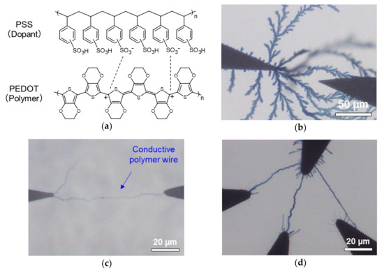 PEDOT:PSS has been previously grown into the shape of a wire during electrodeposition under a bipolar square-wave alternating current (AC) voltage between two electrodes immersed in a precursor solution of 3,4-ethylenedioxythiophene (EDOT) monomer and PSS [13,14,15,16]. The resulting PEDOT:PSS wire was used to construct information-processing circuits [17]. The electropolymerization of PEDOT proceeds on the surface of the anode immersed in the precursor solution, where PSS becomes incorporated as a dopant to deposit PEDOT: PSS with a higher-ordered structure. The morphology of the resulting PEDOT:PSS can be controlled by adjusting the growth voltage conditions [18,19]. For example, either dendritic or wire-shaped PEDOT:PSS may be produced, as shown in Figure 1b,c, respectively (experimental details given in Figure S1). In particular, wire-shaped PEDOT:PSS offers excellent wiring properties due to elongation of the polymer wires along the electric field during anisotropic polymerization. This allows for the formation of an electric circuit network with the PEDOT:PSS wire between arbitrary electrodes (Figure 1d). The appearance of polymer wires growing and linking between electrodes is similar to the ~100 billion neurons that form independently in a newborn human brain, which comprises axons extending to other neurons to form a neural circuit network [20]. Therefore, polymer wires show promise for easily and inexpensively producing information-processing circuits with three-dimensional and spatial integration similar to an actual human brain.