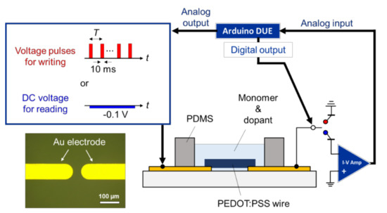 The growth and linking of the polymer wires were conducted between the tips of an electrode gap, where the conductance was adjusted based on continuous conductance readings (Figure 2). The applied voltage control and conductance measurements were based on mechanical relay control using a microcomputer Arduino DUE (Arduino S.R.L., Torino, Piemonte, Italy). An electrode gap of 50 μm was fabricated by patterning a glass substrate via photolithography and the deposition of Cr (10 nm) and Au (190 nm) using EB1100 (Canon Anelva, Kawasaki, Kanagawa, Japan). The precursor solution contained 0.135 M EDOT and 0.02 M PSS (Sigma-Aldrich, St. Louis, Missouri, USA) in a mixture of acetonitrile and ultrapure water (1:1). A polydimethylsiloxane (PDMS) cavity was fixed around the tips of the electrode gap and filled with the precursor solution. A growth voltage was applied to the Au electrodes immersed in the precursor solution to facilitate electrodeposition of the conductive polymer wires at the electrode and wire tips, where the electrodes became linked with the polymer wires. The growth voltage was a bipolar square-wave AC voltage generated using an arbitrary waveform generator WF1973 (NF Corporation, Yokohama, Kanagawa, Japan) connected to a bipolar amplifier HSA4101 (NF Corporation, Yokohama, Kanagawa, Japan). The read direct current (DC) voltage of −0.1 V and voltage pulses for the conductance modification were generated from the analog output pin of the microcomputer, which was connected to a self-made voltage amplifier capable of offset control. In-situ optical microscopy was conducted from beneath via a glass substrate using an inverted optical microscope IX73 (Olympus, Shinjuku, Tokyo, Japan) (Figure 1b–d). Optical microscope images of the dried samples were acquired from the top using a digital microscope VHX-500 (KEYENCE, Osaka, Osaka, Japan). Atomic force microscopy (AFM) images of the dried samples were obtained by SPA 400 (SII Nano Technology, Chuo, Tokyo, Japan) in dynamic force mode.