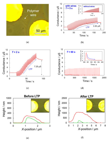 Expression of synaptic long-term potentiation (LTP) characteristics due to the application of periodic voltage pulsing (V = 2.5 V, W = 10 ms, 30 pulses) to an electrode gap linked by polymer wires. (a) Optical microscope image of the Au electrode gap and several bridging polymer wires before pulsing. (b) Change in conductance between the electrodes during continuous pulsing at T = 5 s, where the inset illustrates a control experiment of an electrode gap without any bridging polymer wires. (c,d) Change in conductance between the electrodes during continuous pulsing at T = 2 and 60 s, respectively. (e,f) Optical microscope images and atomic force microscopy (AFM) height profiles of the polymer wire before and after the expression of LTP, respectively.