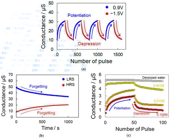 A previous study by the current authors demonstrated an increase in conductance value between electrodes due to linking of conductive polymer wires to achieve synaptic long-term potentiation (LTP) [21,22], which was applied in a synaptic device [17]. General electronic synaptic devices reproduce the change in synaptic strength by adjusting the resistance [23,24,25]. However, PEDOT:PSS is a stable material, and an effective way to selectively depolymerize the wires after linking has not yet been reported. In other words, previous reports on our synaptic device were able to increase the conductance value between the electrodes, but not decrease it. Therefore, a network constructed by wiring is unable to learn flexibly according to the surrounding environment after network formation.