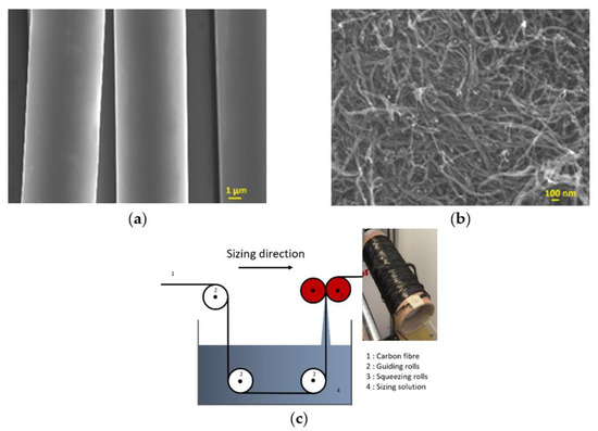 Bundles of 12,000 filament (12K) CFs T700 SC 31E (Toray carbon fibres Europe) were used in this work which contained an epoxy-compatible sizing agent. A sizing formulation was made of U6-01 (MICHELMAN) composed of a polymer film to bind filaments together, and a polymeric coupling agent to promote fibre–matrix interactions, and thus create strong interfaces between the fibre and matrix resin in the composite. CNFs are not soluble in water due to their inert surfaces; therefore, the non-ionic surface-active agents, Brij S20 (BS20) surfactants, were used to disperse them in aqueous media. The surfactant was a Polyethylene glycol octadecyl ether and had a molecular mass of about 1152 g/mol. The sizing content obtained was up to 2.2 wt.% and the nanofiller concentration in the sizing layer was between 1 and 10 wt.%. As seen in Figure 1a, T700 SC 31 E CFs (T700), with a diameter of approximately 7 μm, were sized with complex formulations containing CNFs (Figure 1b), emulsifiers, anti-static agents and lubricants. A CF spool was first unwound at 5 m/min, passing in a sizing bath, and then it was squeezed into a calendar, dried using infrared (IR) light source combined with hot air, and finally collected onto another bobbin, as shown in Figure 1c.