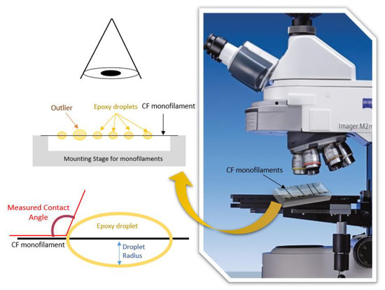 Wettability assessment was performed on the sized CFs by two methods. In the first method, the epoxy droplet spreadability was measured. A bundle of sized CFs was attached to a flat metal substrate, grabbed from both ends, and stretched and glued onto the substrate’s edges. An epoxy droplet was applied on the surface from a 4 mm orifice using gravity (droplet average diameter: 4.5 mm, volume: ~40 mm3). The spreading of the droplet on the bundles was recorded by a high-resolution video camera, and captions were taken from deposition time (t0) to equivalence time (teq = 90 s). Three measurements were performed at different points on the surface of the samples, from which the average spreading time and standard deviation were calculated. The measurements took place at room temperature, since a room temperature curing epoxy resin was used, with a low viscosity. For the quantification of the spreading time (by measuring the length of the spreading droplet), the Image J software was used. In the second method, the CA of microdroplets was measured in order to detect differences in the microscale. One monofilament was selected and isolated from the CF bundle and, with the help of scotch tape, it was then attached to a plexiglass holder, under tension. Microdrops (30–200 μm in diameter) of epoxy resin were placed on the monofilaments, using a micro-syringe. For statistical reasons, only microdrops 40–60 μm in diameter were used to measure up to 10 monofilaments. Images for each specimen were captured through optical microscopy using a Zeiss Axio Imager A2.m microscope at the moment of placement, in order to measure the average CA [15]. A schematic representation of the assembly is shown in Figure 2.