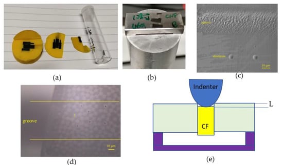 Firstly, in the push-out test, a suitable area on top of the groove (between the two lines) was selected (Figure 3d) and the thickness of the specimen was measured by recording the distance change in the focus from the flat area of the holder to the specimen surface. Secondly, the individual CF, i.e., CF 1, was identified under optical microscopy (Figure 3d). Then, a load was gradually applied to each individual location using the diamond indenter in sequence from an initial load of 10 μN to a maximum peak load at a loading rate of 1 mN/s (Figure 3e). The peak load was greater than the critical load and was decided experimentally for each specimen. The average interfacial shear strength (IFSS) at the fibre/matrix interface is provided by [14]: