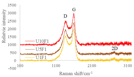 The unsized CFs’ surface was smooth and clean without any defects (Figure 1a). After CNFs sizing, the surfaces of the CFs were smooth and even (Figure 4a,c,e). For sample U1F1, the CNFs were sparsely distributed on the surface (Figure 4b). When the amount of CNFs in the sizing agents increased, more CNFs were incorporated into the sizing layer of the CFs, as seen in Figure 4d,f. As can be seen in the Raman spectroscopy in Figure 5, G (1595 cm−1) and D (1367 cm−1) peaks can be identified on the surface of the sized CFs. With the absorbing of 5–10% CNFs on the surface peaks, 2D can also be found at (2722 cm−1).