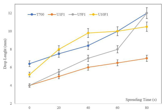 The epoxy droplets spreading on the CNF-based sized bundles of various concentrations are shown in Figure 6. The specimen with 5 wt.% CNFs (U5F1) had a similar behaviour to the commercial sizing until 60 s of spreading, with a slight increase in the deposited droplet at the same time. After 60 s the results showed a sharp increase in spreading. The specimen with a sizing of 10 wt.% CNFs (U10F1) showed the highest rate of spreading for the first 40 s, reaching a plateau afterwards. The lowest CNF concentration sizing (1 wt.% CNFs-U1F1) showed a linear spreading behaviour, with the lowest rate of all the samples tested, indicating that a high affinity was achieved with the epoxy resin.