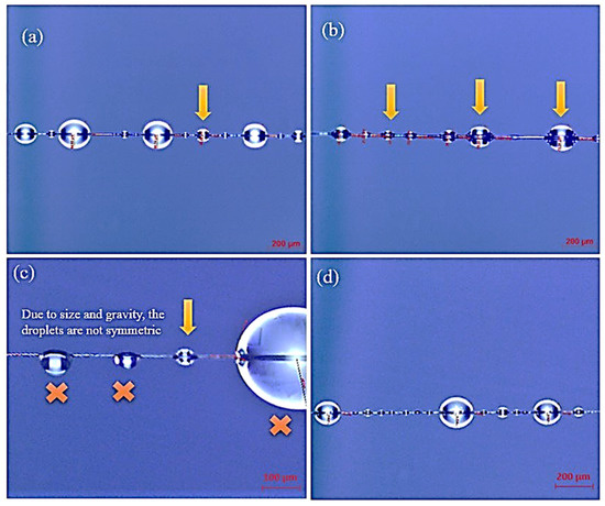 According to the spreadability results, it was decided to proceed with single-fibre wettability testing to detect differences in the microscale. The optical images taken on single fibres are shown in Figure 7 and the average CAs are presented in Table 2.