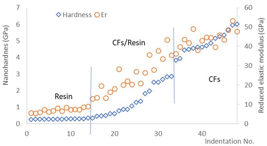A mapping nanoindentation test was carried out to measure the nanomechanical properties of the CFRPs. After the examination of the indentations via microscopy and the corresponding of the indentations to the CFs, the resin, interfaces, hardness and reduced elastic modulus can be calculated; the results of the T700 reinforced composites are shown in Figure 8. CFs have a much higher nano-hardness and reduced modulus than those of the resin. Meanwhile, the hardness and elastic modulus changes gradually at the interface between the CFs and the resin depending on the location of the indentation, which ensures the high-strength carbon fibre reinforces the relatively low-strength resin to obtain the desired properties of the composite materials. There is no significant change in the results measured for the sized CFs with the CNF-reinforced composites; therefore, a more precise method such as the push-out method needs to be used to assess the impact of the addition of CNFs to the interfacial properties.