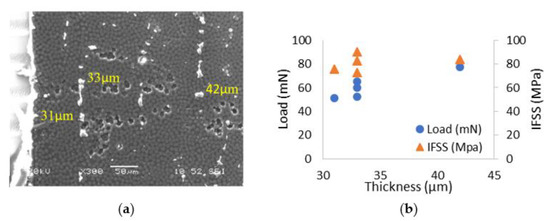 For the sample U10F1 (sizing with 10% CNFs), different areas of the samples with varied thicknesses were tested. Generally, the edge of the specimen was thinner, and it became thicker with the move to the centre of the specimen, as seen in Figure 10a. The corresponding critical load and calculated IFSS with different thicknesses (31 µm, 33 µm and 42 µm) are shown in Figure 7b. It can be seen that the critical load increases with the thickness of the specimen; however, the IFSS only changes slightly with the thickness. Nine tests on a total of 77 CFs were conducted and the average IFSS was 72 ± 9 MPa.